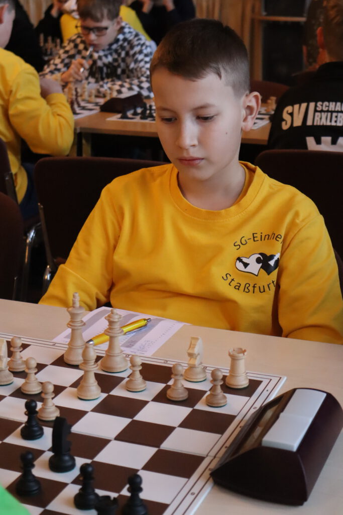 Das längste und spannendste Duell des Tages lieferten sich Leo Kutschenreuther (Schachzwerge Magdeburg) und Henrik Bartelheimer (SV Rochade Magdeburg). Fast drei Stunden lang rangen beide Spieler um den Sieg, analysierten jede Stellung bis ins Detail und ließen keinen Fehler zu. Am Ende stand ein für beide Seiten versöhnliches Remis, das dem hohen Niveau dieser Partie absolut gerecht wurde.